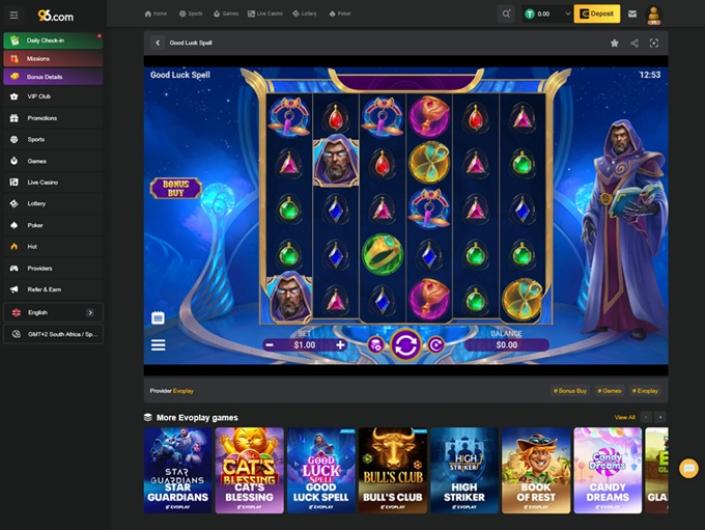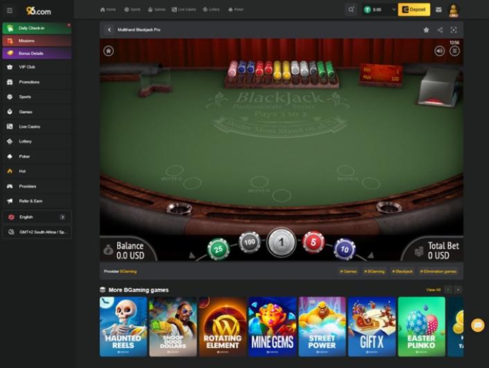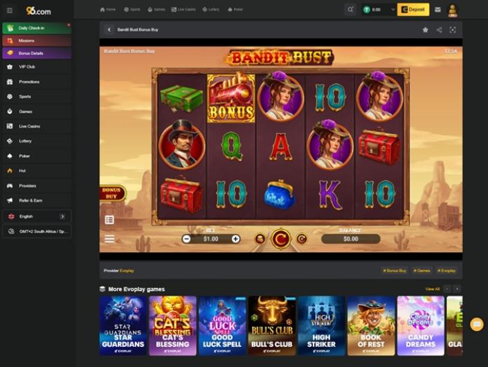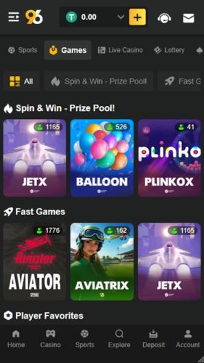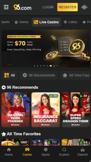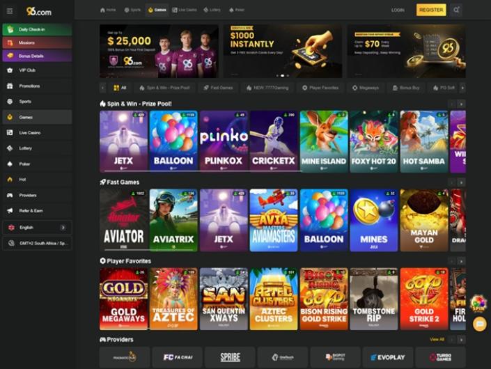 La première impression que l'on a de 96.com est qu'il s'agit d'un site Web moderne proposant une variété de jeux et d'options de paris pour tous les budgets. La mise en page est claire, facile à naviguer et extrêmement conviviale. La page d'accueil propose les dernières offres et promotions, ainsi qu'un bref aperçu des avantages offerts aux VIP et des jeux les mieux notés.