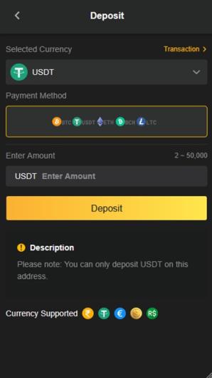 Les devises acceptées sont le Bitcoin, le Bitcoin Cash, l'Ethereum, le Litecoin et le Tether.