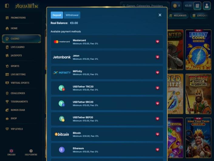 - Le Casino AquaWin accepte plusieurs méthodes de paiement en monnaie fiduciaire et en cryptomonnaie, notamment Mastercard, Skrill, Neteller, Jeton, MiFinity, le Tether, le Bitcoin, l'Ethereum, le Litecoin, le Ripple, l'USDCoin, le Bitcoin Cash, et le Dogecoin.