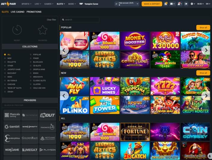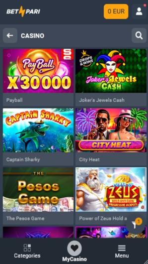 Le Casino BetPari propose une gamme impressionnante de jeux provenant des meilleurs fournisseurs tels que CT Interactive, PG Soft, MrSlotty, 7Mojos, TrueLab, Red Rake Gaming, Quickspin, et bien d'autres encore. Machines à sous, jeux de casino en direct ou quelque chose qui sort un peu de l'ordinaire, il y en a pour tous les goûts.