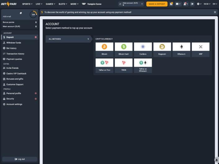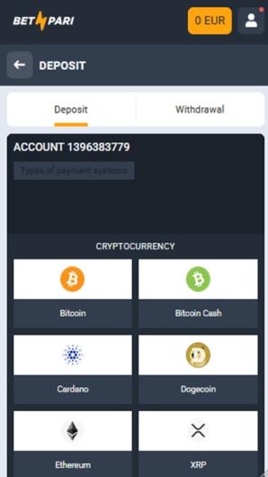 Le Casino BetPari reste à la pointe de la technologie en acceptant plusieurs cryptomonnaies populaires. Vous pouvez effectuer des dépôts et des retraits en utilisant le Bitcoin, l'Ethereum, le Litecoin, le Dogecoin, le Bitcoin Cash, le Tether, le Cardano et le Tron.