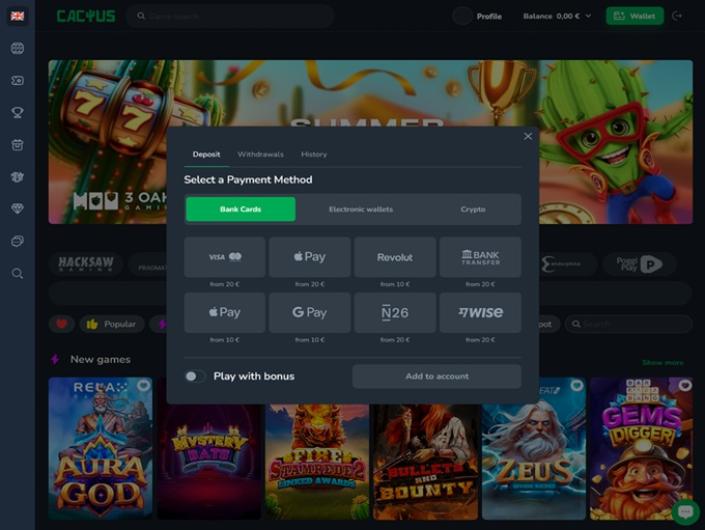 Les adeptes des méthodes de paiement traditionnelles seront ravis d'apprendre que le Casino Cactus prend en charge les cartes bancaires et les portefeuilles électroniques, garantissant ainsi des transactions flexibles. Pour un grand nombre de méthodes, le montant minimal à déposer est adapté aux joueurs occasionnels, ce qui permet à chacun de profiter des meilleurs jeux, quel que soit son budget.