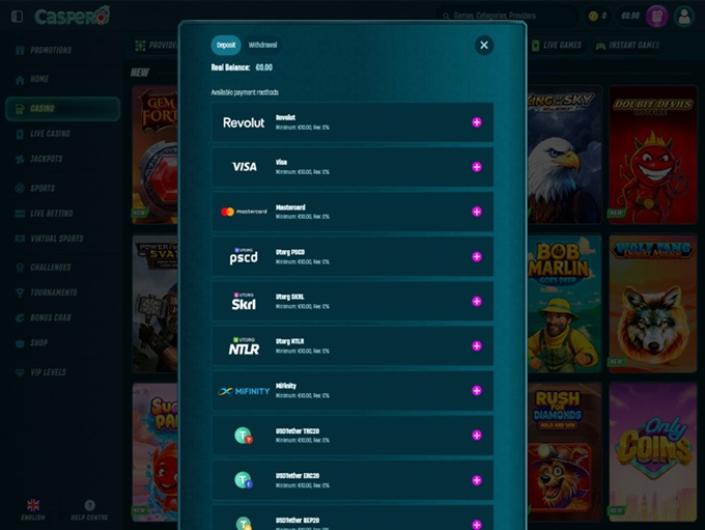 Le Casino Caspero offre diverses méthodes de paiement telles que le virement bancaire, MiFinity, Visa et MasterCard, pour n'en nommer que quelques-unes, ainsi que de nombreuses options crypto comme le Bitcoin, le Bitcoin Cash, le Cardano, le Dogecoin, l'Ethereum, le Litecoin, le Ripple, le Tether et l'USD Coin.
