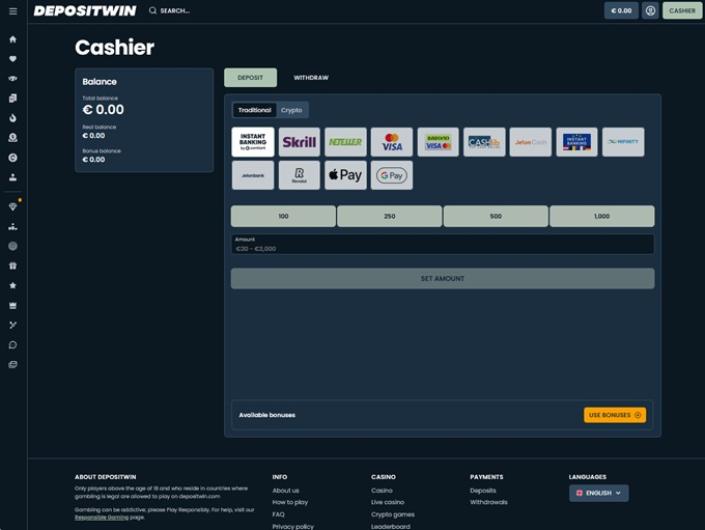 Le Casino DepositWin est un casino en ligne exploité par Versus Odds B.V, une société basée à Curaçao qui détient une licence pour mener des opérations en ligne délivrée par l'organisme de réglementation Antillephone N.V.