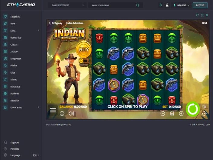 Le Casino ETH offre à ses clients la possibilité de découvrir les jeux en mode « DEMO », même s'ils ne sont pas inscrits. En cliquant sur l'aventure souhaitée, les utilisateurs sont informés de la volatilité et du RTP du jeu, de la présence ou non d'un Buy Bonus et du mode « Jouer gratuitement ».