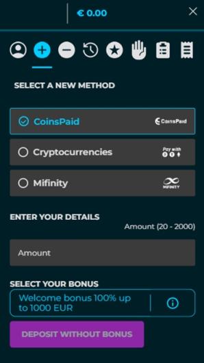 Le site propose une variété de cryptomonnaies à utiliser telles que le Bitcoin et l'Ethereum. Il utilise Coinspaid comme processeur pour ce type de paiements et de transferts. Cependant, ce n'est pas très pratique pour les joueurs qui découvrent les cryptomonnaies, car il n'y a absolument aucune FAQ ou autre information sur la façon d'utiliser le système. Si vous êtes familier avec ces méthodes de paiement, cela pourrait bien être votre meilleure option. Si ce n'est pas le cas, nous vous conseillons de vous en tenir aux méthodes de paiement normales, qui offrent également un large éventail d'options et de devises à utiliser.