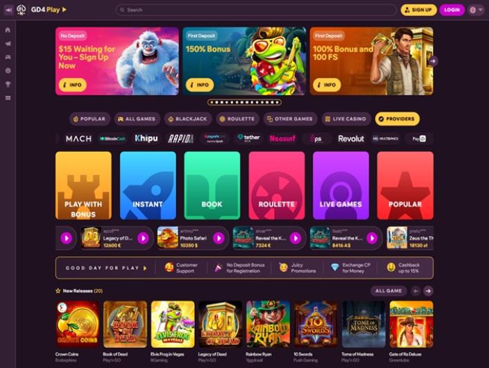 GoodDayForPlay (GDF Play) est classé 383 sur 419 casinos passés en revue avec une note de 2.2 sur 5 après 198 votes et il a2751 machines à sous proposées par Amatic Industries, Aristocrat, Ash Gaming et 29 autres avec une note moyenne de 3.8 sur 5 après 100391 votes.