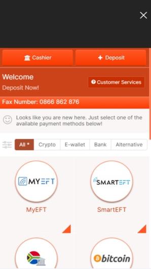 ...vous trouverez diverses options de paiement possibles, telles que Visa et Neteller. Cette diversité n'existe pas en matière de devises et de langues. Le site n'est disponible qu'en anglais et la seule devise proposée est le ZAR (rand sud-africain).