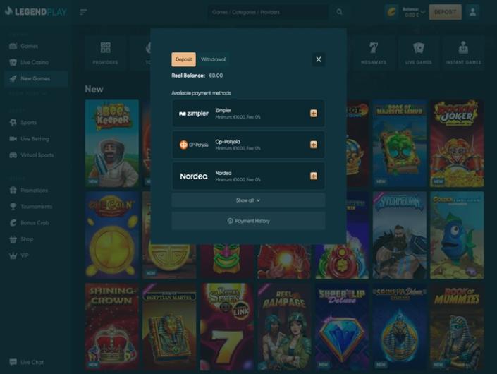 Toujours à jour, Legendplay renouvelle constamment sa ludothèque en y ajoutant les dernières nouveautés des meilleurs fournisseurs du marché. L'interface est facile à utiliser. Vous pouvez passer d'un jeu à l'autre, ou des sports en direct, par exemple, à n'importe quel jeu de casino en un seul clic, et ceci indique clairement que la plateforme est conçue pour être extrêmement pratique pour les utilisateurs.