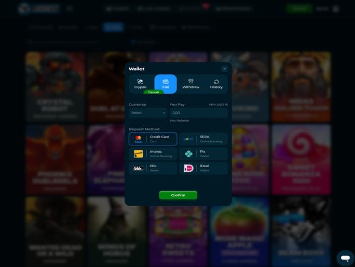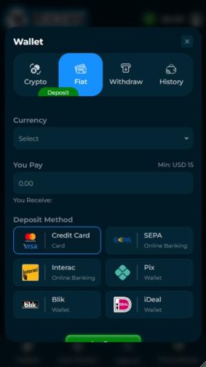 - L'opérateur prend en charge un large éventail de méthodes de paiement fiduciaires telles que les cartes de crédit et de débit, les portefeuilles électroniques et les virements bancaires, ainsi que les cryptomonnaies telles que le BTC, l'Ethereum, l'USDT (ERC20 et TRC20) et l'USDC.