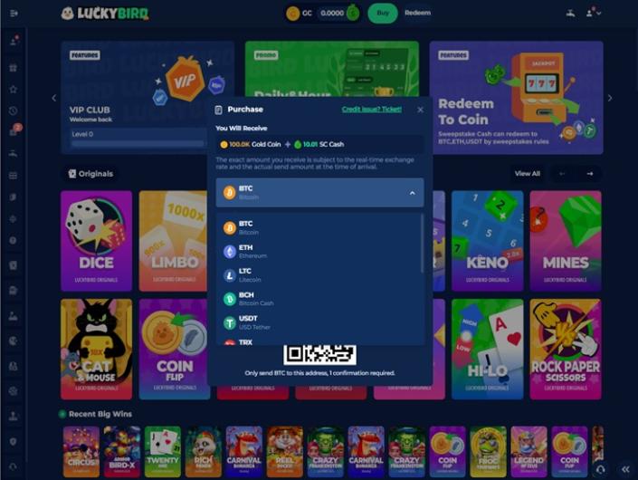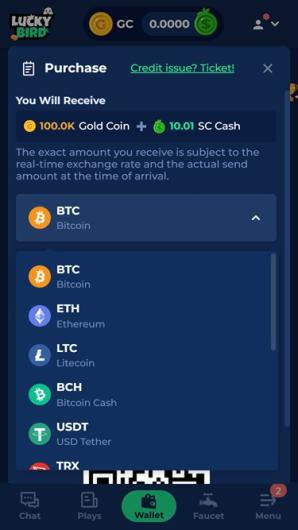 La raison de cette « ode » aux cryptomonnaies est simple : le Casino LuckyBird appartient à des plateformes qui acceptent les cryptomonnaies. Cela signifie que les joueurs peuvent acheter des Gold Coins en utilisant une variété de cryptomonnaies telles que le Bitcoin, le Litecoin, l'Ethereum, le Dogecoin, le Litecoin Bitcoin Cash, le Tether, le Tron et le Ripple.