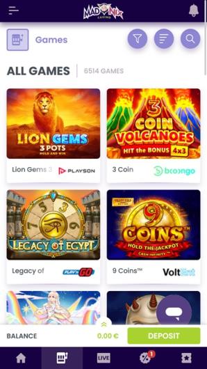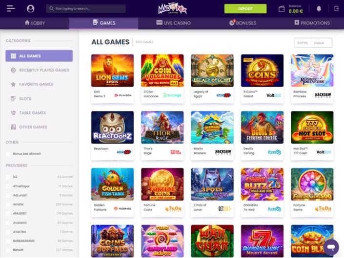 Pour garantir une navigation fluide, le Casino Madnix a regroupé ses jeux par grandes catégories afin que les joueurs n'aient aucun mal à trouver l'aventure souhaitée. Outre par genre, il est possible de parcourir les jeux par fournisseur. BetSoft, Amatic, Nolimit City, Felix Gaming, Red Rake Gaming et Wazdan ne sont que quelques-uns des nombreux studios avec lesquels ce casino coopère.