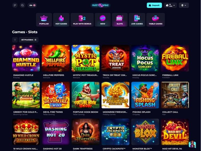 PartySpinz dispose d'une bibliothèque de jeux vaste et variée où chaque joueur peut trouver son bonheur. En plus des machines à sous en ligne, qui restent le choix numéro un à travers le monde, le site web offre de la roulette, du blackjack, du baccara et du poker, ainsi que des jeux indiens populaires.