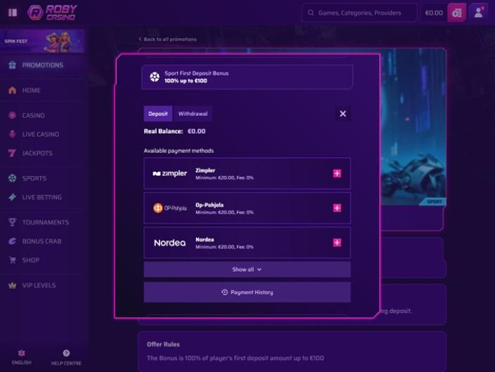 Au-delà des jeux de casino, le Casino Roby offre encore plus de divertissement grâce à sa section de paris sportifs extrêmement complète et polyvalente. Les paris sportifs en ligne continuant d'être un moyen très apprécié de parier dans le monde entier, cette section dédiée offre une expérience complète. Les joueurs peuvent facilement accéder aux informations sur les ligues et les événements majeurs, découvrir les paris populaires et à venir dans des sports spécifiques, gérer leurs bulletins de paris et utiliser d'autres ressources utiles. Pour rester informés et suivre les compétitions qui se déroulent en temps réel, les visiteurs peuvent opter pour le raccourci « paris en direct » et obtenir une représentation pratique de ce qui se passe en ce moment, des paris populaires et des événements à venir. De plus, il existe une gamme de bonus exclusifs conçus spécifiquement pour les amateurs de paris sportifs.