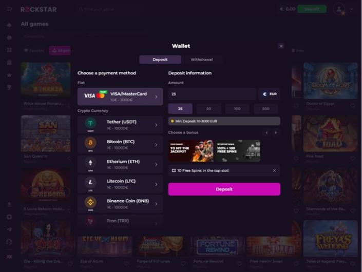 Depuis ses débuts, le Casino Rockstar est une plateforme qui accepte les cryptomonnaies, notamment le Bitcoin, l'Ethereum, le Litecoin, le Tron, le Tether et le Ripple. Les cryptomonnaies offrent une expérience de jeu supérieure avec une sécurité renforcée, un traitement plus rapide et des frais de transaction moins élevés par rapport aux services bancaires traditionnels.