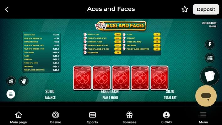 Vidéo Poker : Jacks or Better, All American, Bonus Poker, Deuces Wild, Aces and Faces, Joker Poker, Tens or Better, Double Double Bonus Poker, Aces and Eights, American Poker Gold.