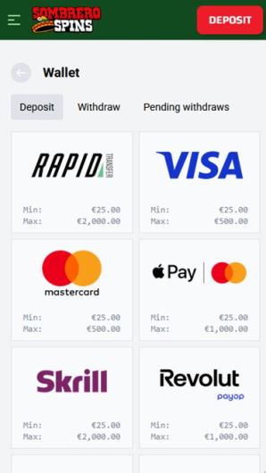 Le casino Sombrero Spins offre une expérience conviviale qui reflète son thème dynamique. La riche palette de couleurs vert foncé, inspirée par l'essence du mode de vie mexicain, s'harmonise parfaitement avec le nom du casino, créant une atmosphère unique et invitante. La vitesse du site est impressionnante : les pages se chargent rapidement et sans difficulté, ce qui permet aux joueurs de se lancer dans leur expérience de jeu sans attendre. Cette combinaison de design captivant et de performance rapide rend l'exploration du casino à la fois agréable et efficace !