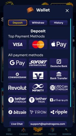 SpinDragons ne fait pas exception. Suivant les tendances du secteur, le site web facilite les paiements rapides, peu coûteux et sans tracas. Toutes les principales cryptomonnaies sont acceptées, assurez-vous simplement que votre dépôt respecte les exigences minimales pour la devise de votre choix.