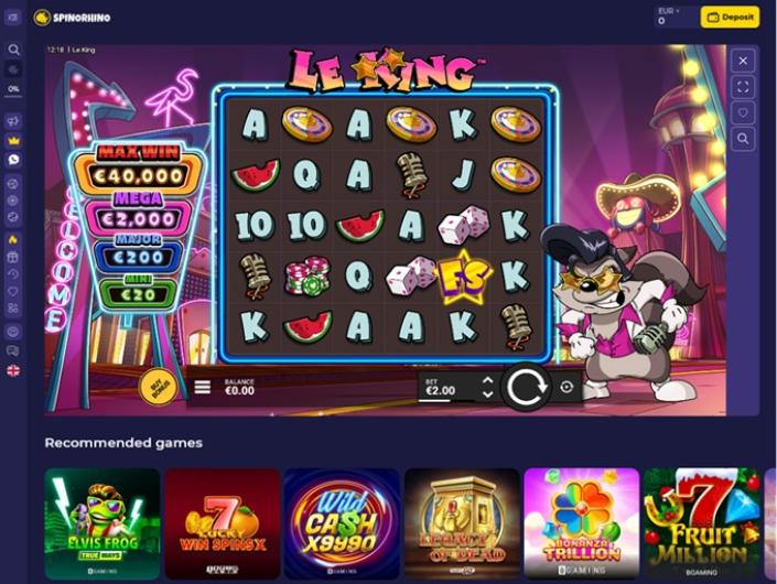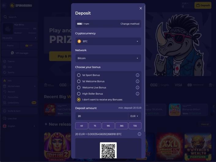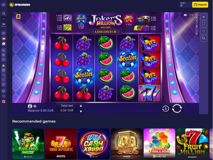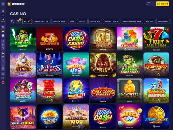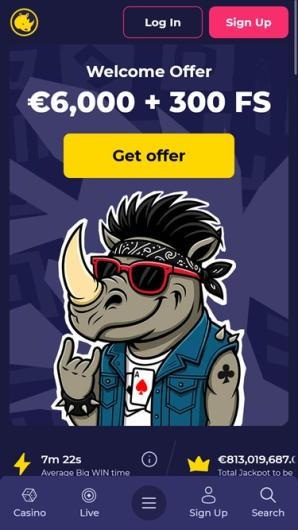 Une fois la page principale chargée, vous serez accueilli par la mascotte du casino, un rhinocéros sympa, qui vous présentera une promotion de bonus de bienvenue en cours, tandis que le reste de l'offre se trouve dans le menu situé dans le coin supérieur gauche.