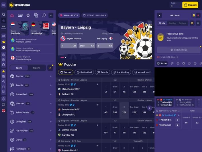 Il y en a probablement pour tous les goûts dans la section paris sportifs de Spinorhino, que vous soyez amateur de sports traditionnels, de ligues sportives internationales ou d'eSports ! C'est un excellent complément pour ceux qui préfèrent les paris sportifs aux machines à sous ou autres jeux de casino.