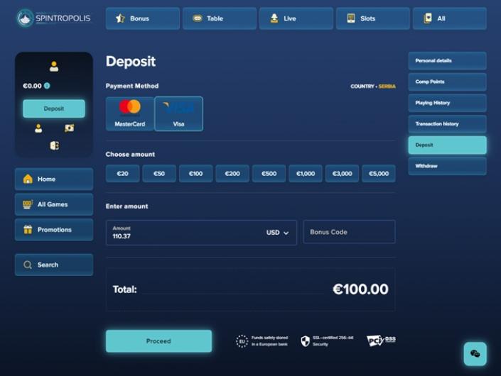 Bienvenue à Spintropolis ! Cette ville du futur vous propose une incroyable tournée de jeux qui englobe une grande variété de machines à sous, de jeux de table et de jeux en direct. Vous vous sentirez le bienvenu dès le départ grâce à de nombreuses promotions ainsi qu'à des points de fidélité qui peuvent être échangés en cash.