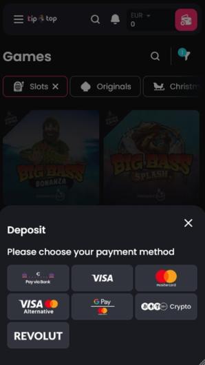 Déposer des fonds et retirer des gains est assez facile lorsque vous avez un compte chez Tip-top.bet grâce au large choix de méthodes de paiement et à la disponibilité des cryptomonnaies. Bien que le choix des options que les joueurs voient dans la caisse dépende du pays de résidence, vous pouvez toujours contacter le support client si vous avez besoin de conseils sur la meilleure méthode pour votre région.