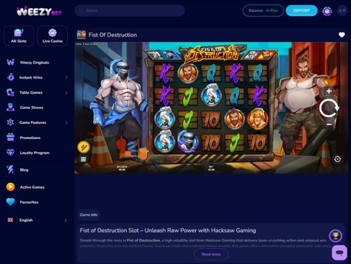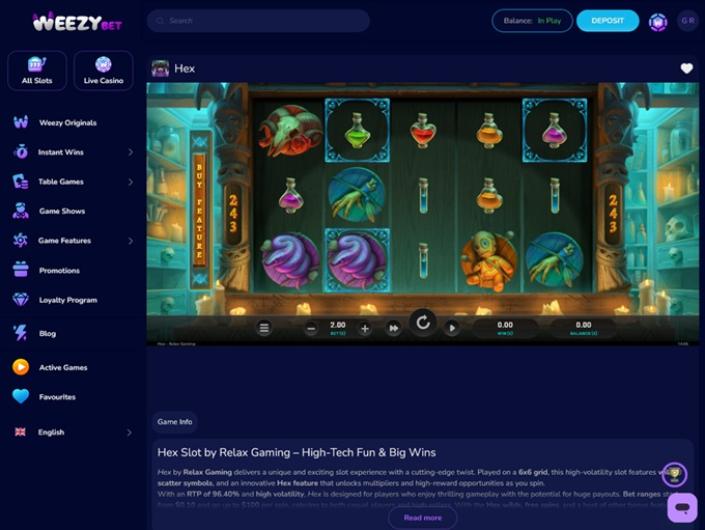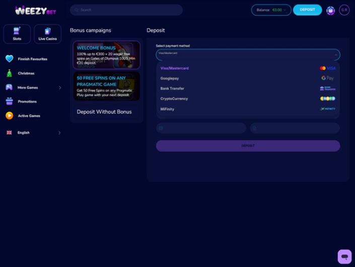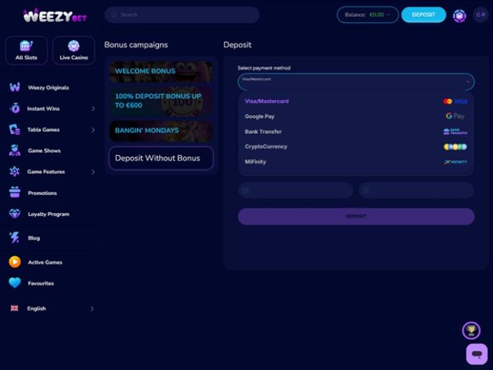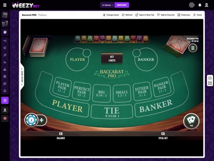 WeezyBet.com est un site de jeux en ligne qui est avant tout fier d'être une plateforme leader de l'industrie en ce qui concerne les relations avec les clients. Mais ce n'est pas tout, car les joueurs qui visitent ce site auront accès à un portefeuille passionnant et diversifié, ainsi qu'à un programme promotionnel attrayant qui les incitera à poursuivre leurs activités pendant toute la durée de leur séjour.
