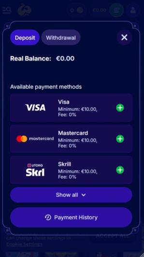 Le Casino Wishwin propose diverses méthodes de paiement telles que le virement bancaire, MiFinity, Visa et MasterCard, pour n'en citer que quelques-unes, ainsi que de nombreuses options cryptographiques telles que le Bitcoin, le Bitcoin Cash, le Cardano, le Dogecoin, l'Ethereum, le Litecoin, le Ripple, le Tether et l'USD Coin.