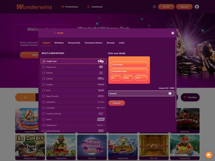 Le plus grand avantage de jouer sur Wunderwins est sans aucun doute l'infrastructure de paiement. Le site propose plus de 50 méthodes de paiement différentes, notamment les cryptomonnaies, les virements bancaires, les portefeuilles électroniques, les bons de paiement et les cartes de crédit et de débit. Des méthodes de paiement locales sont également disponibles pour de nombreuses régions, comme l'Europe de l'Ouest, le Canada, l'Asie du Sud-Est, le Brésil, l'Australie et les pays nordiques. Les dépôts sont instantanés et les retraits sont traités rapidement, en particulier via les portefeuilles électroniques et les cryptomonnaies.