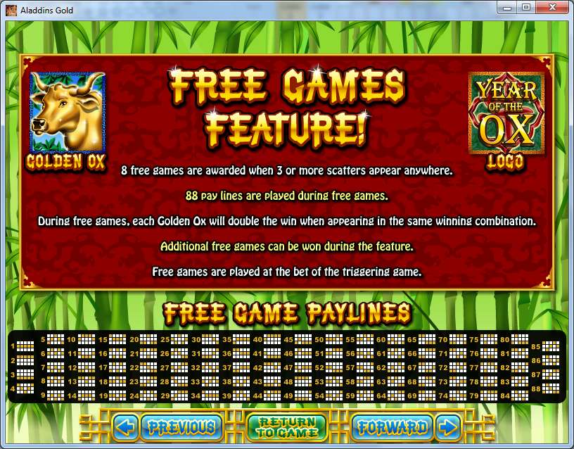 Trois symboles "année du bœuf" ou plus donnent droit à 8 tours gratuits. Ce qui est impressionnant ici, c'est que 88 lignes payantes, au lieu des 25 maximum, seront en jeu, ce qui signifie encore plus de chances de gagner.