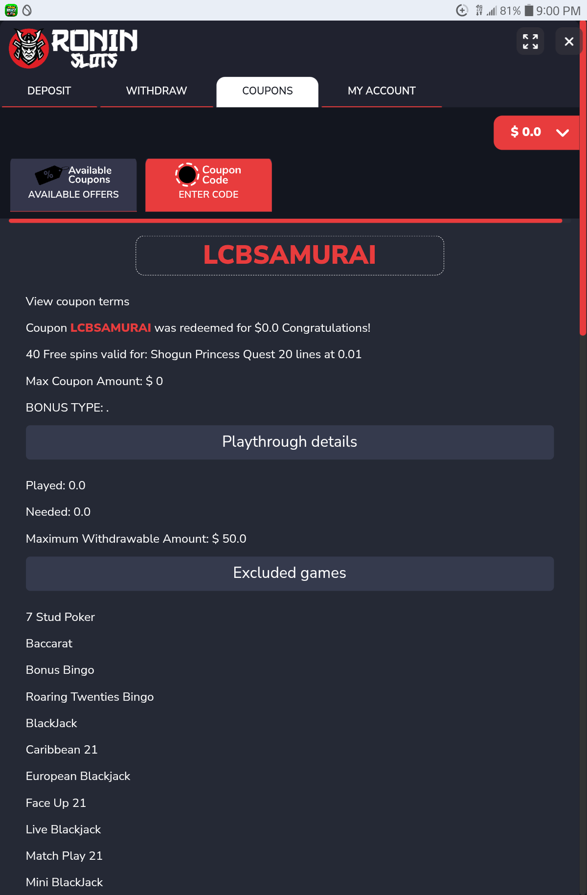 Bonus Code: LCBSAMURAI
