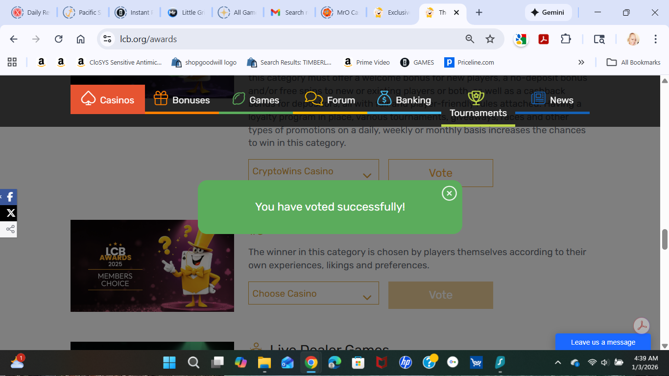 Bravo ! J'ai voté pour Cryptowins dans la catégorie des avantages Prime.