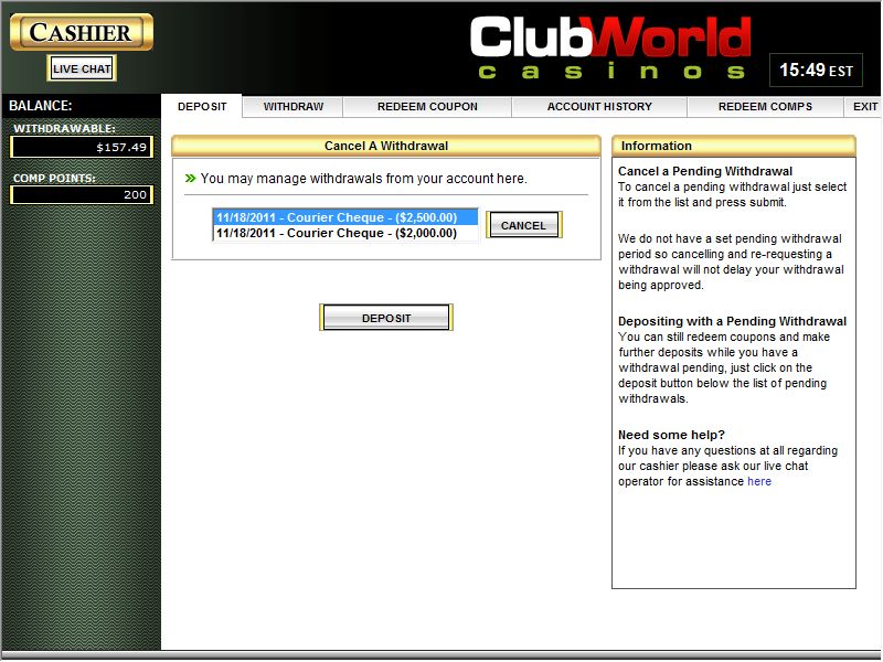 OK...I just managed a pretty sizable win today and have yet to cash out with Club World, even tho I initiated several withdrawals, i always reversed them