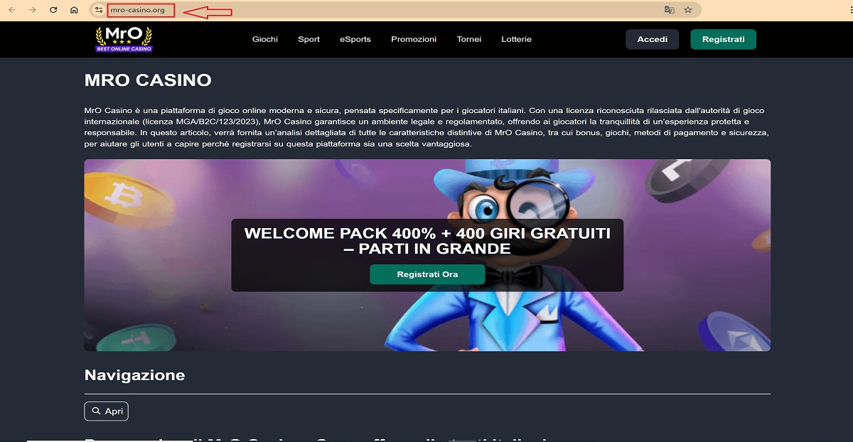 The website mro-casino.org operates as a misleading online gambling platform that falsely presents itself as the legitimate MrO Casino. By using a look-alike domain name, displaying the original MrO Casino logo, and publishing casino-related content in Italian, the site creates a strong impression of official affiliation with mrocasino.com, despite having no verified connection.