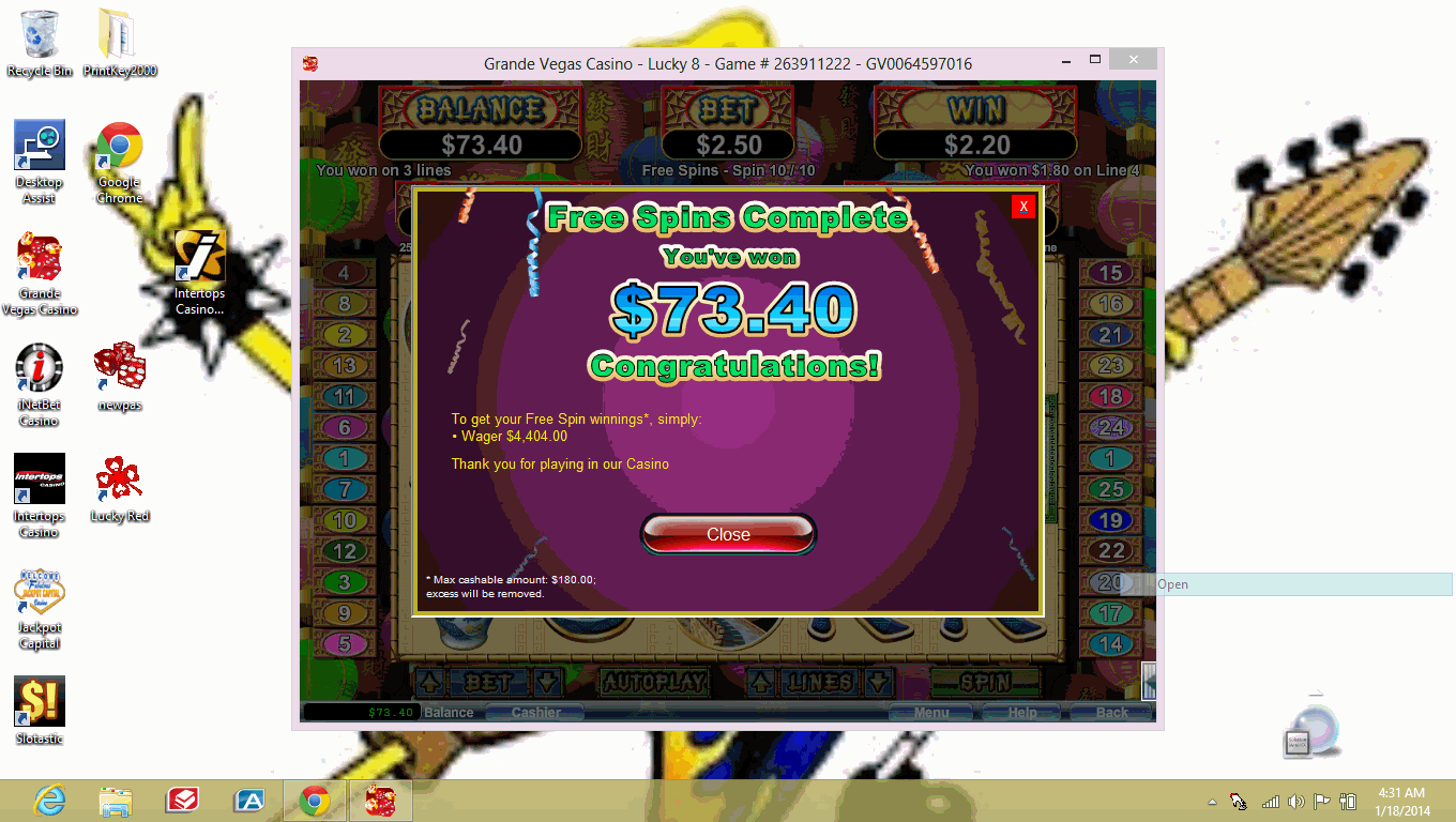 Une fois, j'ai eu une situation similaire sur Jackpot Capital, mais après plusieurs chance incroyables, j'ai rempli les conditions de mise et j'ai encaissé 180 $.