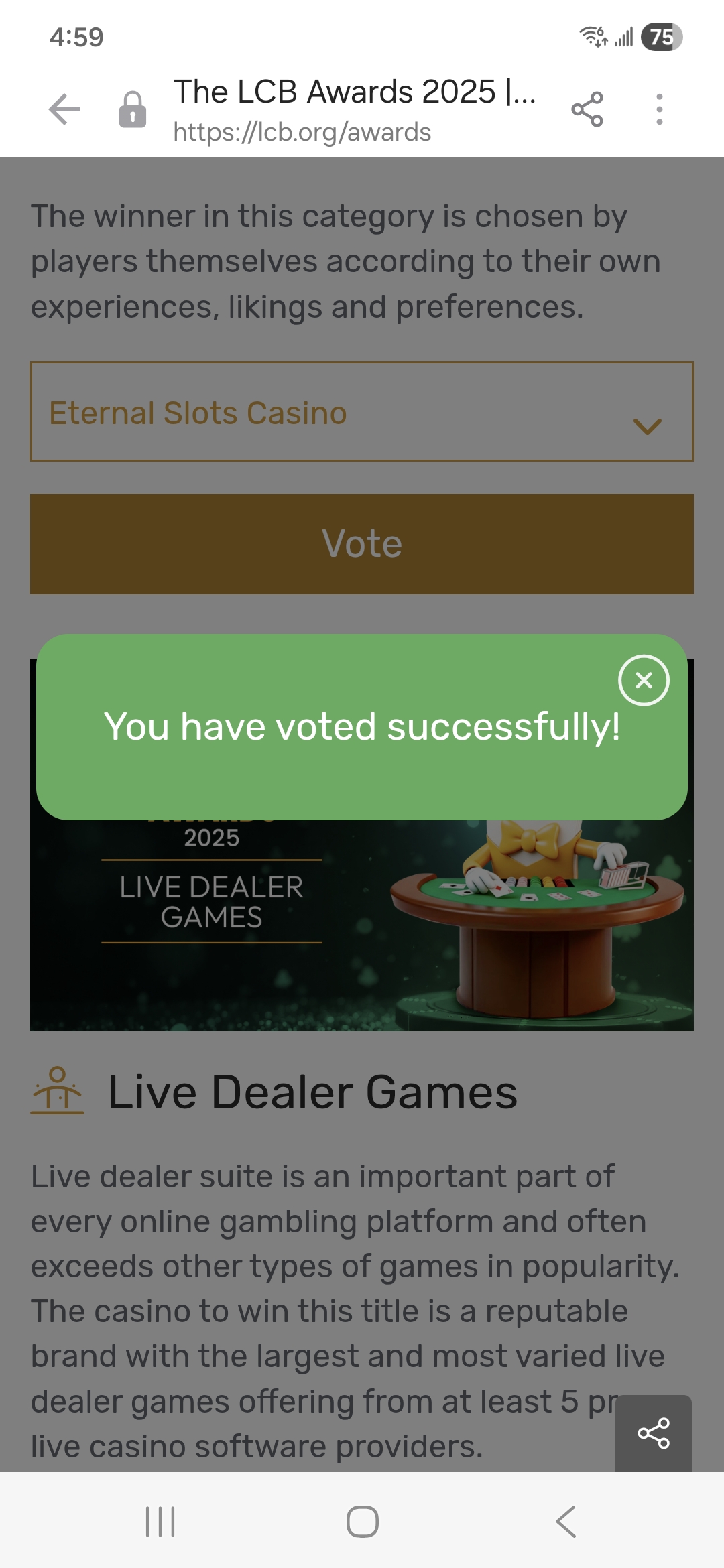 If you’d like to take part and vote in the LCB Awards 2025 $6,000 cash contest, you can find all the details on our LCB Awards page — including how to participate and cast your vote.**Please note** If a casino has promoted free spins or other perks for voting, please reach out to the casino directly to claim the offer. We recommend taking a screenshot of your member name on this voting page as proof. LCB is not connected to any LCB Awards-related promotions offered by casinos themselves.
