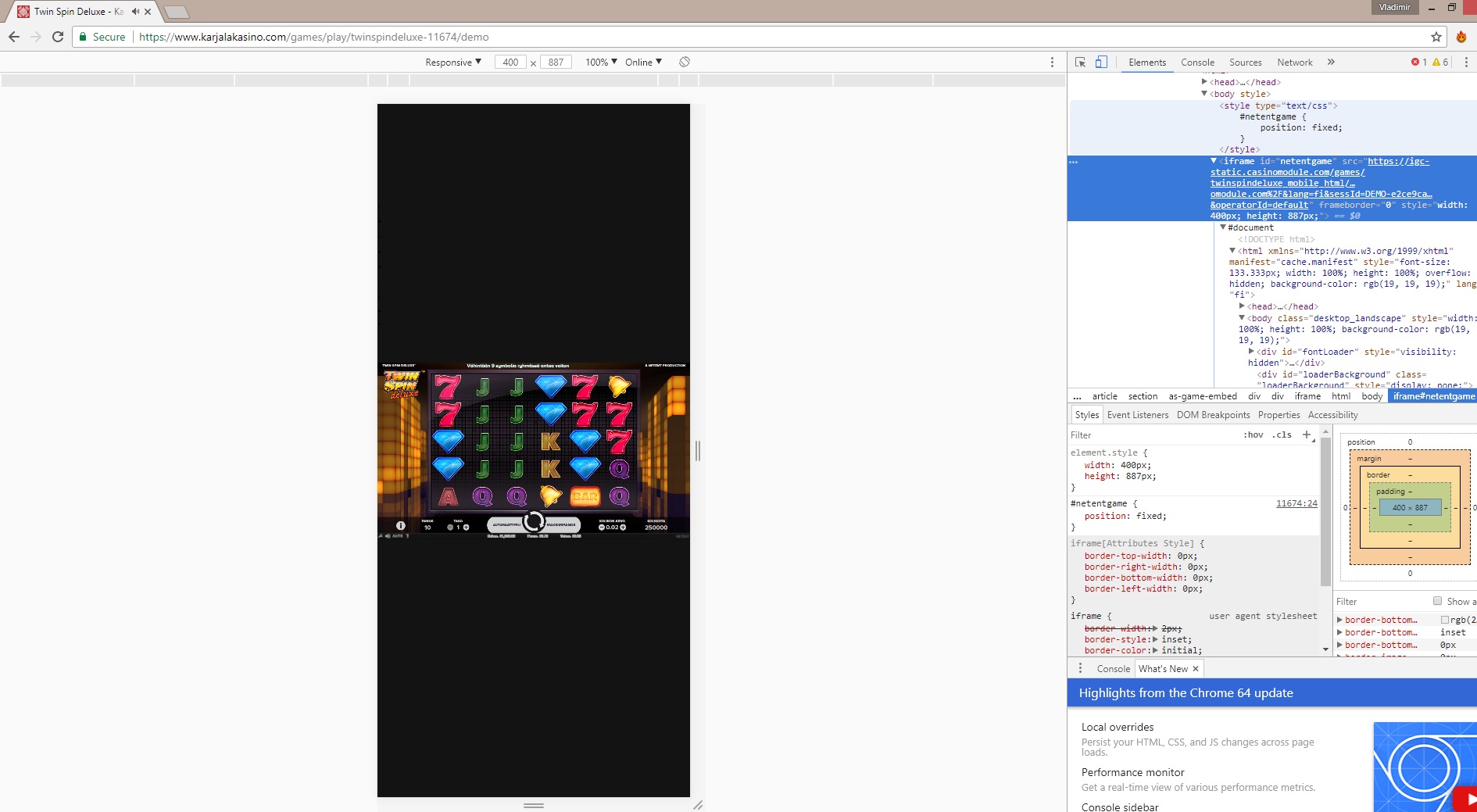 Vous n'avez pas raison Metz1013. Vous ne pouvez pas déterminer la source du jeu comme vous l'avez essayé, vous devez inspecter le code source du jeu, ce que je ne suis pas sûr que vous puissiez faire via un appareil mobile, mais vous pouvez utiliser les outils fournis dans le navigateur de bureau Chrome pour simuler un mobile. Regardez la capture d'écran que j'ai faite, vous verrez que la source est bien igc-static.casinomodule.com, ce qu'elle est censée être.