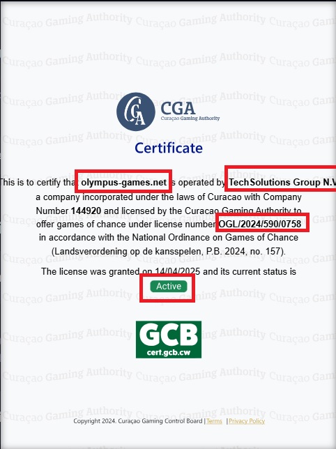 Le document publié sur le Le site web olympus-games.net indique que TechSolutions Group NV (numéro d'enregistrement de la société 144920) est le titulaire de la licence et fait référence au numéro de licence OGL/2024/590/0758, précisant que la licence a été délivrée le 14.04.2025 et que son statut actuel est ACTIF.