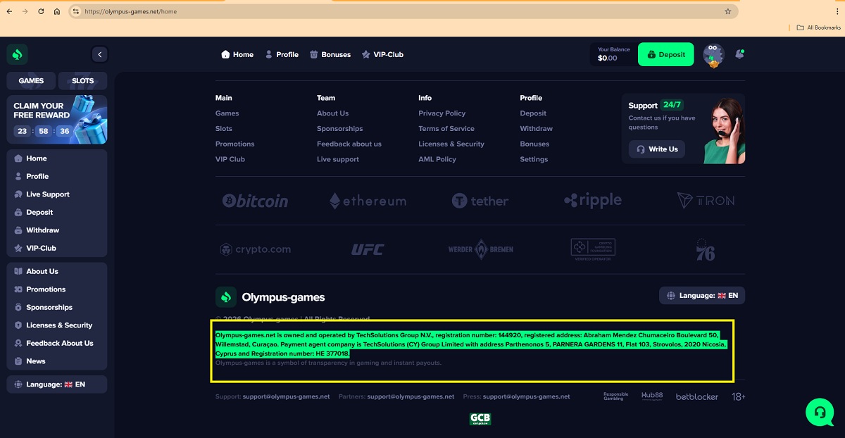 "olympus-games.net is owned and operated by TechSolutions Group N.V., registration number: 144920, registered address: Abraham Mendez Chumaceiro Boulevard 50, Willemstad, Curaçao. Payment agent company is TechSolutions (CY) Group Limited with address Parthenonos 5, PARNERA GARDENS 11, Flat 103, Strovolos, 2020 Nicosia, Cyprus, and Registration number: HE 377018."