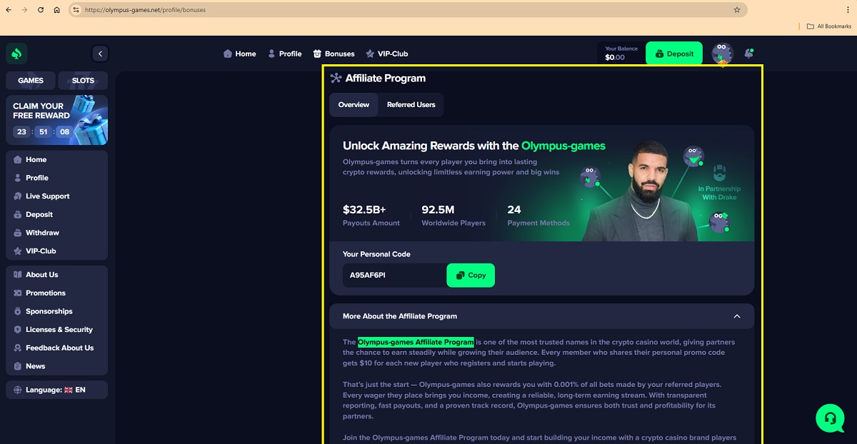 Based on the available public information, there is no verifiable evidence that a legitimate iGaming or crypto casino affiliate program operated under the name “Olympus-games Affiliate Program” currently exists. The claims describing a Olympus-games Affiliate Program — including guaranteed payments of $10 per registered player, ongoing earnings of 0.001% of all bets, and references to transparent accounting and fast payouts — cannot be substantiated through reliable or industry-recognized sources.