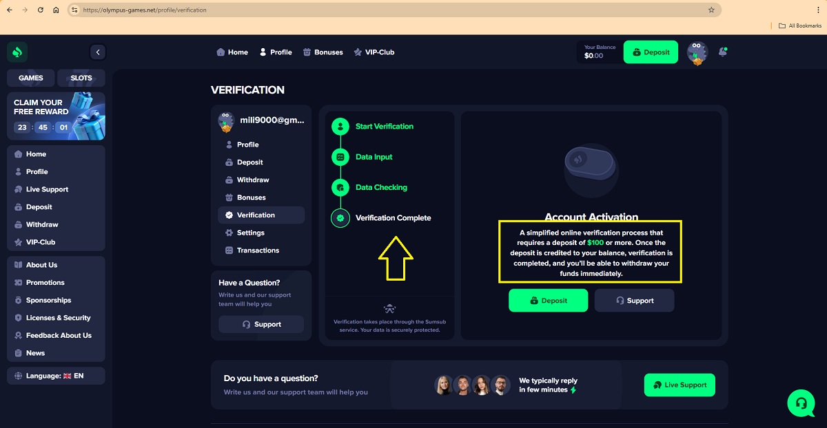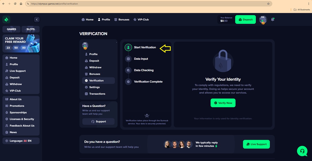 The alleged player account verification process on olympus-games.net represents a key scam pattern commonly used by fraudulent “casinos” to deceive players. When accessing their profile under the Verification tab, players are presented with a four-step process that is portrayed as a legitimate account verification procedure.