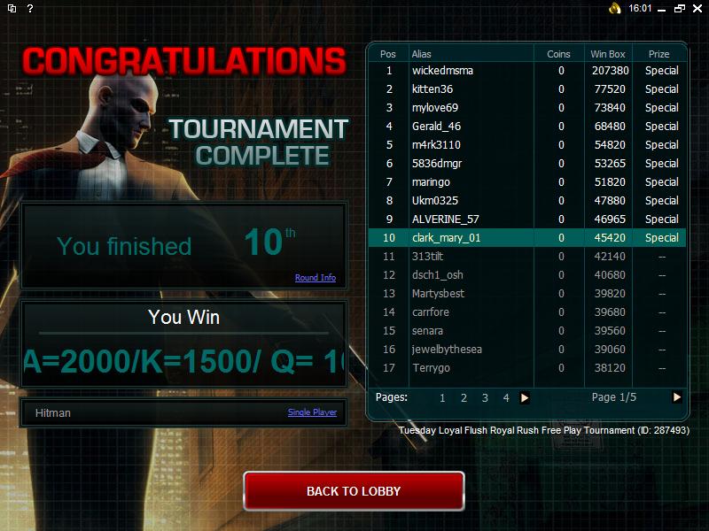 Here are tthis weeks tournments I won hope I did the insert right. Played at Grandbay Casino, the winning credits have not been put in my account, and they did not even give me a complementry chip for the inconvience. So hopefully by Monday 4/06/2009 the winningsa will be in my account.
