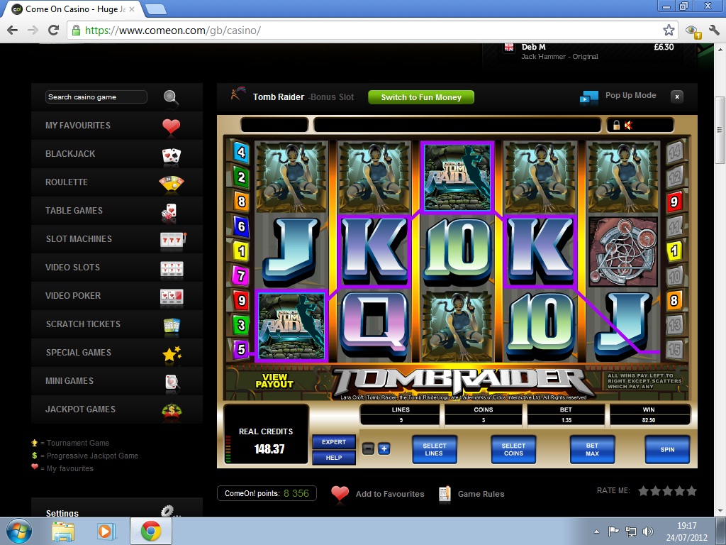 !!5 d'affilée sur Tomb Raider puis est allé sur Mega Moolah et a remporté le jackpot mineur de 164,99
