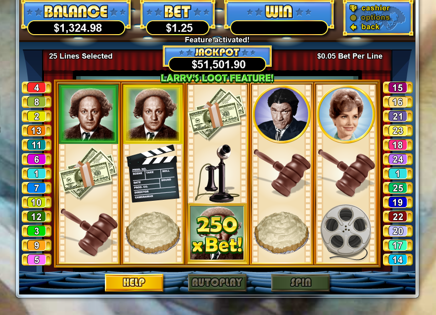 So after that bonus on Bipolar Explorer I went to Year of Fortune and on my 2nd spin got the bonus that retriggered on $1.50 for $150 then off to The 3 Stooges $1.25 proggessive slot and on my 3rd spin Mr. Currly showed up 4 a visit.