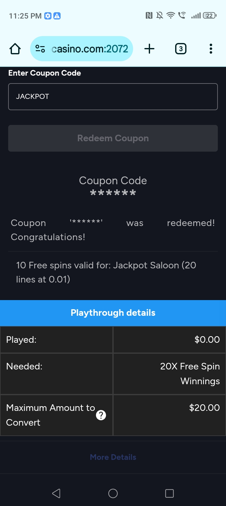 Code : JACKPOT ; Valeur : 20 tours gratuits au Cash Jackpot Saloon ; Mise : x20 ; Retrait maximum : 20 $ ; Mise maximum par main : 5 $ ; Jeux autorisés : Machines à sous NP uniquement ;