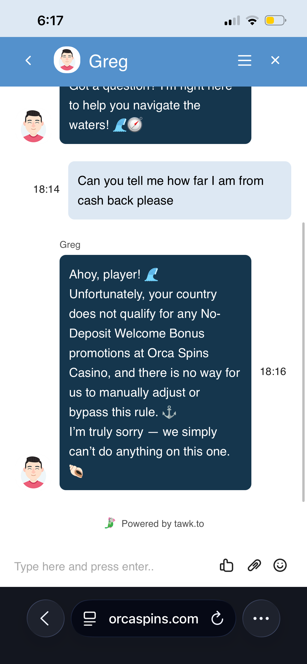 I didn't see a direct response to the question of cashback. Greg only made reference to the restrictions on No Deposit Bonus offers. If you have met the minimum required deposits to qualify for cashback, I would recommend that you email the Pit Boss and customer support. Send information about the deposits made and your request for cashback which was recently denied. Hopefully this will help. Unfortunately, there's no Casino Rep here for Orca Spins..until then, attack with facts and flattery.