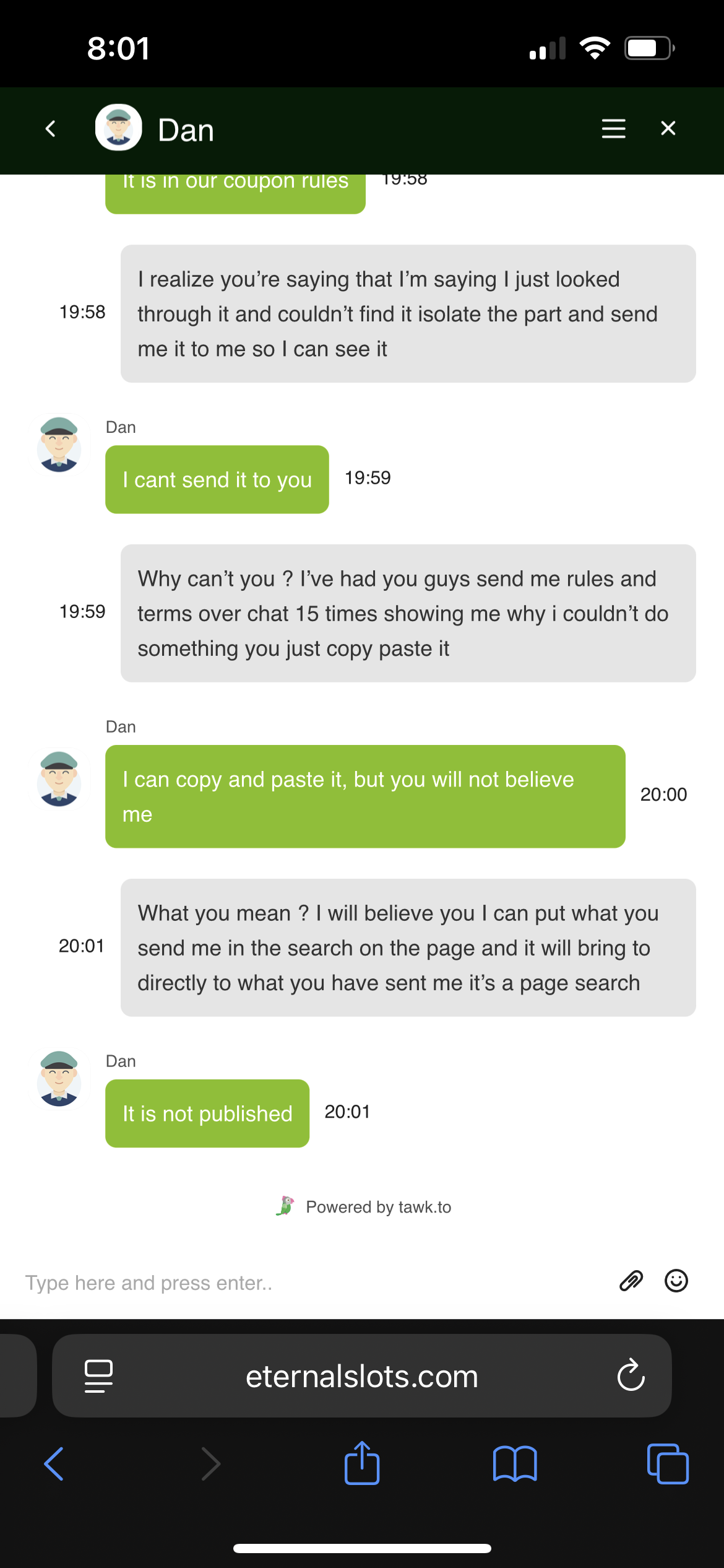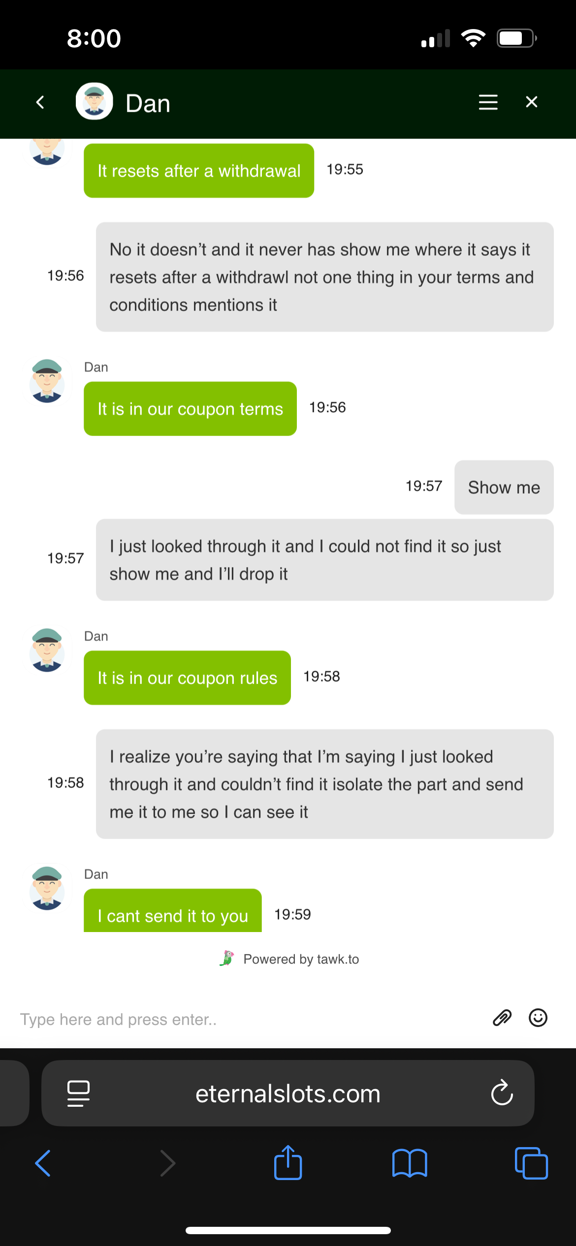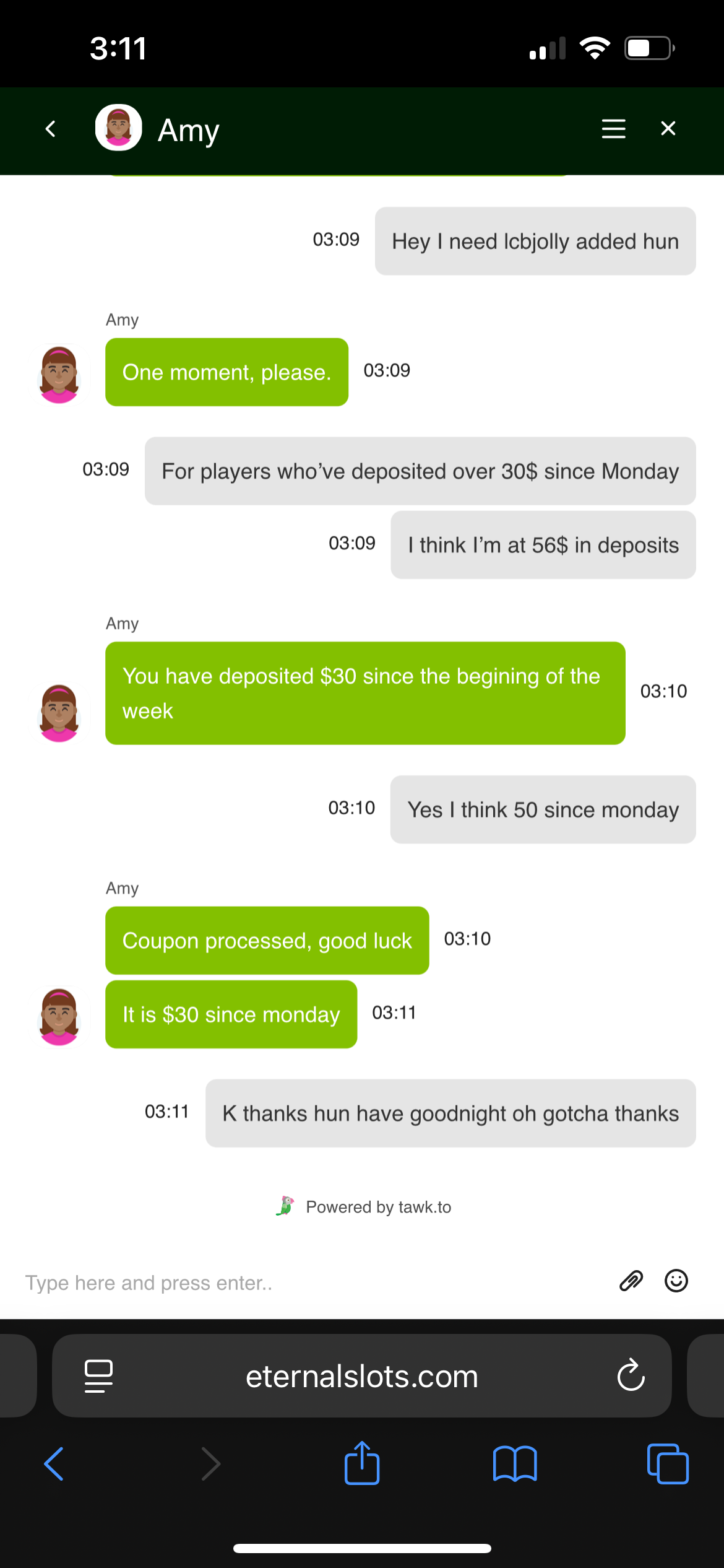 This was for LCBJOLLY , I have deposted over 50$ since Monday . Live agent continues to lie and refuse to add weekly depsit bonuses I've deposited 50$ since Monday and he's lying and pretending making a withdrawl starts your deposit count over . Second agent joined and told me it's in the terms I said just show me , he said "I can copy paste it but you won't believe me" I said yes I will I can use the page search and it will bring me directly to section your talking about . Then he says " it's not published" , so it went from I can copy paste it but you won't believe me , to this rule that they are saying exist isn't published and then he leaves the chat. I attached screen shots with proof of everything , guys don't let them screw you over , when they refuse to add these bonuses that you have paid to be eligible for they are stealing money from you . If the casino doesn't want to their customer service accountable for their behavior we can just embarrass them and expose every time they lie just because they want to screw over the player base