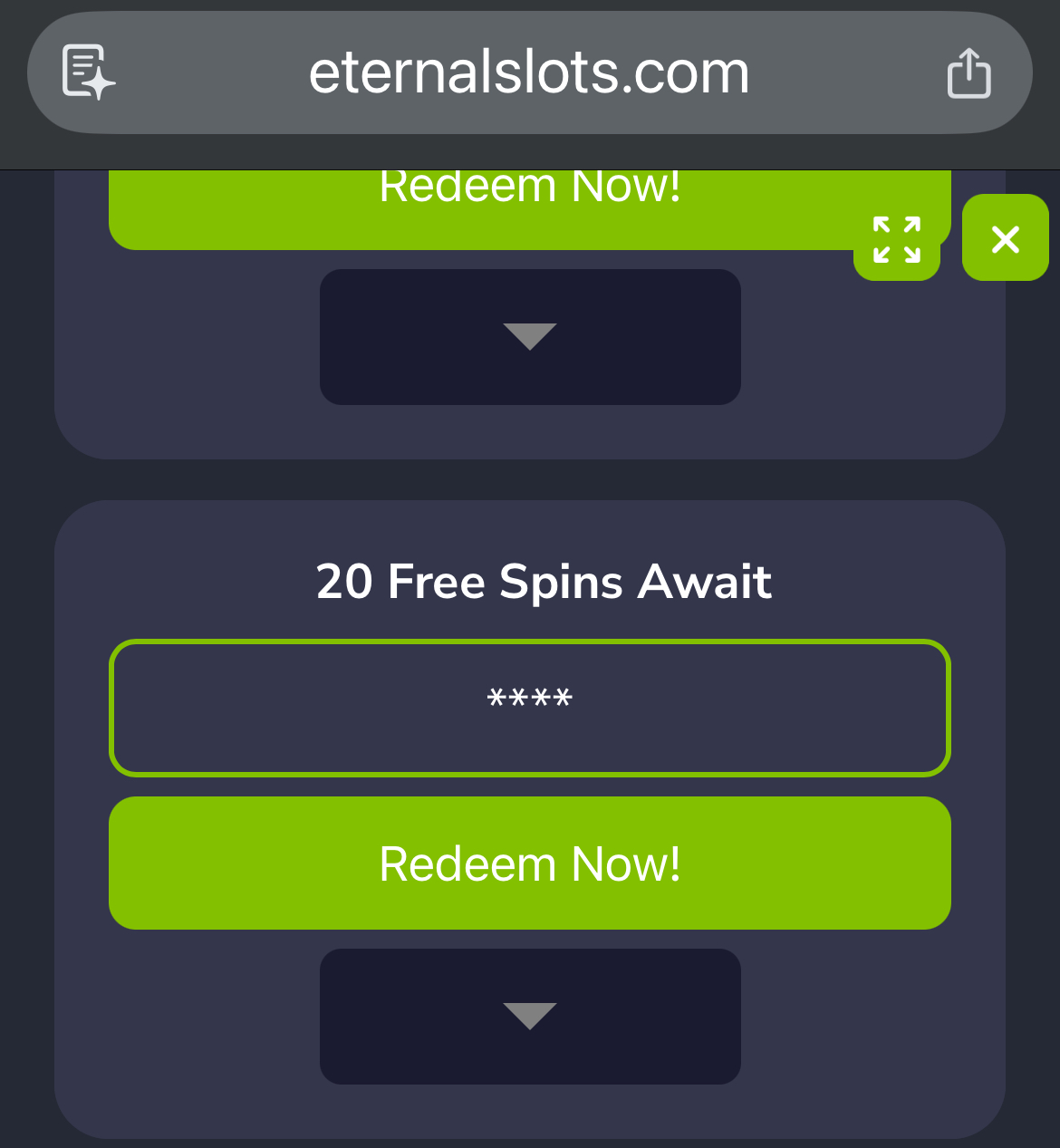 So I am by far an expert but on my accout if i use the regular eternalslots.com it wont allow the 20 free spins but if i use the cdk.eternalslots.com (the wizard hub) it does.