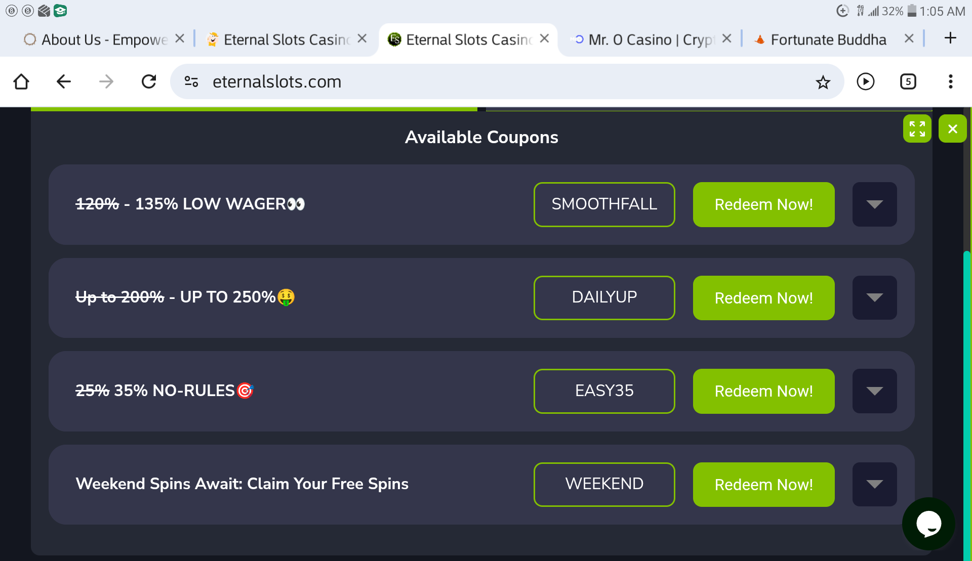 Eternal Slots is becoming a joke! 10 free spins now. Are you kidding me. They hardly ever have free bonus anymore. Nothing. What is going on. Anyone know of any new codes?