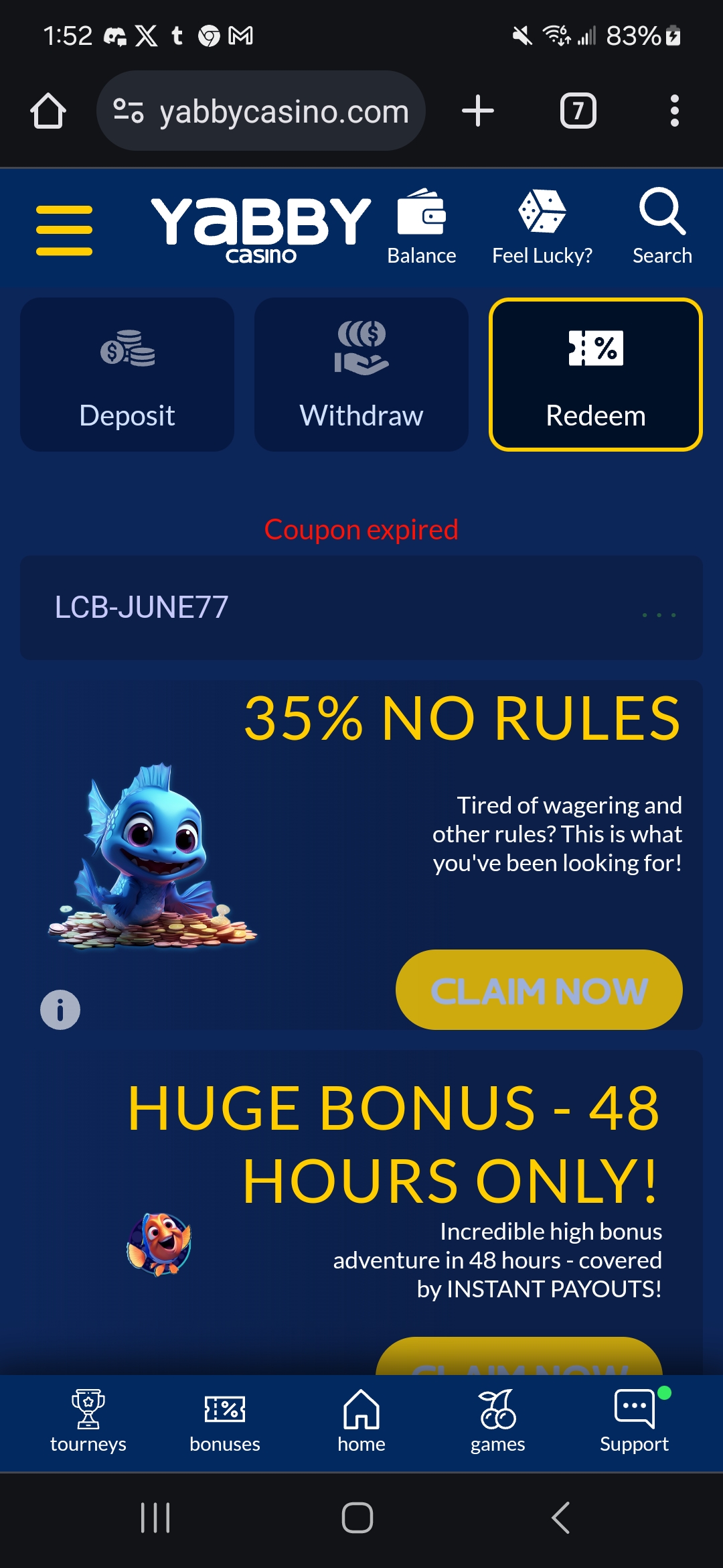 They won't let me redeem LCB-JULY40 even though I JUST DEPOSITED FIRST. I told you, they turn down every single LCB code I try to use. They say it's some ratio problem but idk how they think that because I deposit before I try to redeem and any code I've used has either been taken on the bonus code redemption or it's been issued by actual chat. Not gonna play here anymore bc this is ridiculous. Why am I going to spend money or give money to play but then I can't use ANY bonus codes like other players. This site is a joke anymore. Extreme, Yabby, and Brango are all the same. I'm sure other places will be glad to have another PAYING player bc Yabby apparently does not appreciate their customers or have respect for that matter bc chat is rude lately as well and thats IF they actually come back and reply , when they don't they just leave you on chat. Why post codes that the platform is just going to deny? What a joke